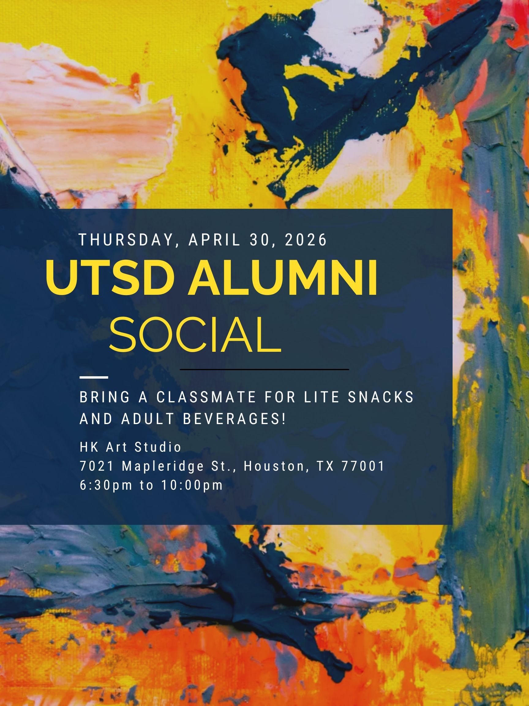 | UTSD Alumni Social | April 30, 2026 | HK Art Studio, 7021 Mapleridge St., Houston 77001 |