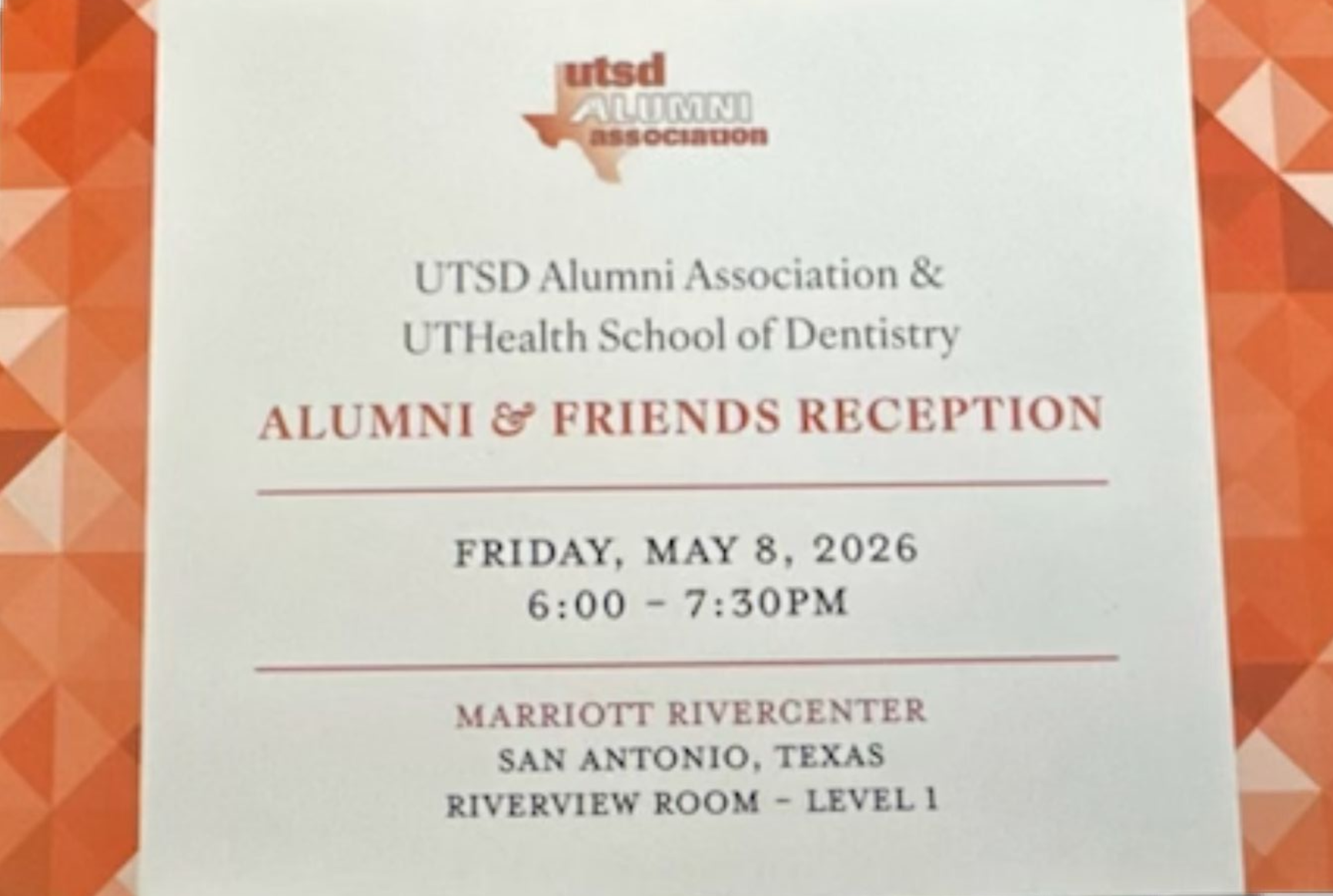 | Alumni & Friends Reception | May 8, 2026 | Marriott Rivercenter, San Antonio, TX Riverview Room - Level 1 |